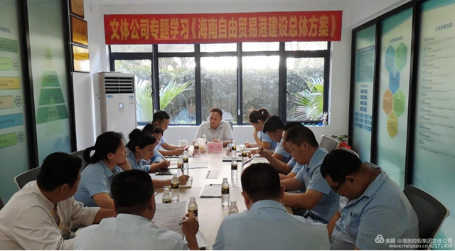 2020年6月11日下午,集团党委委员、副总经理杨飞组织文体公司专题学习《海南自由贸易港建设总体方案》,文体公司董事长金红丽、总经理黄俊、副总经理林少梅、总经理助理兼行政人事部经理温桂萍以及各部门负责人共计13人参加。